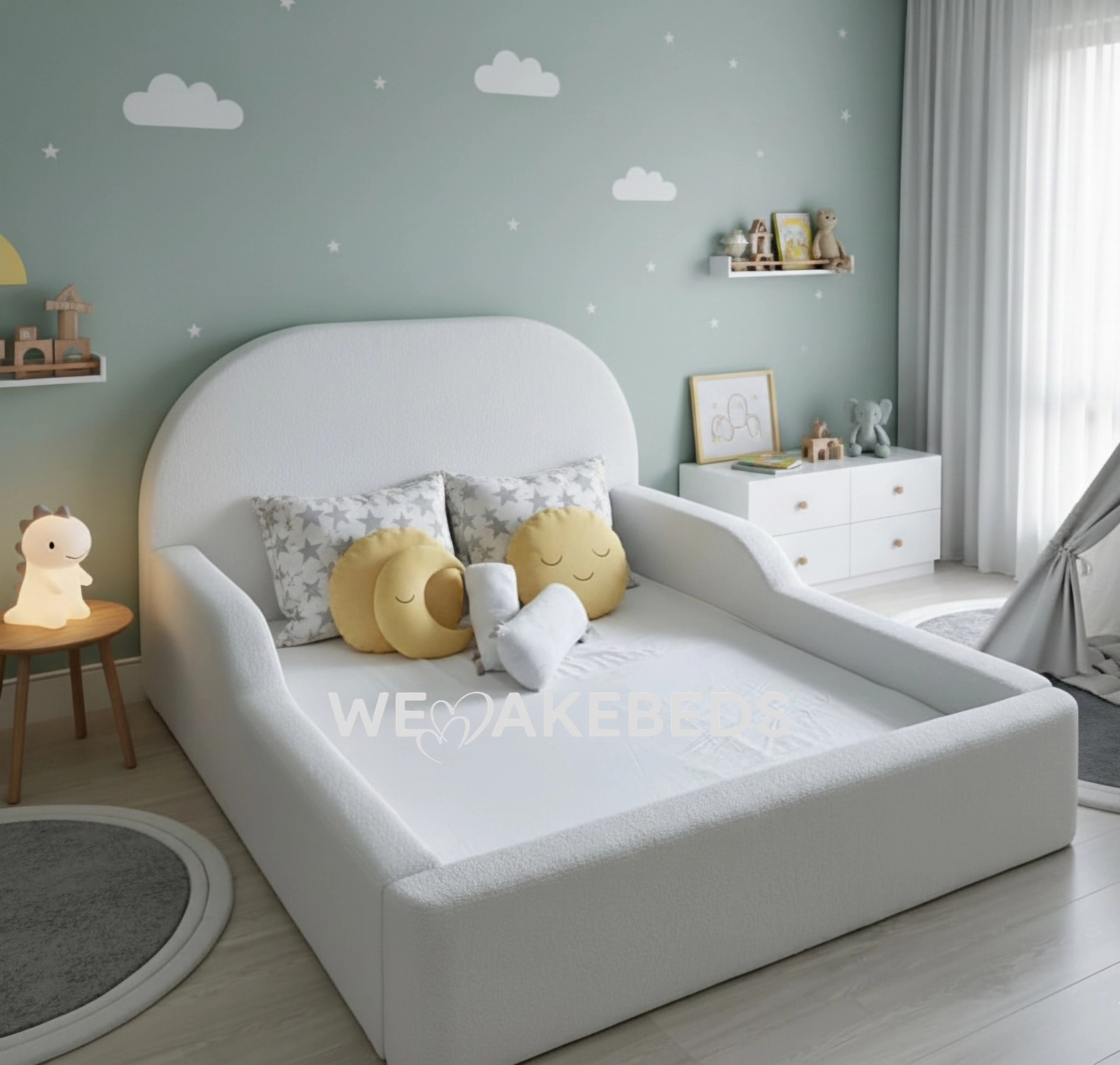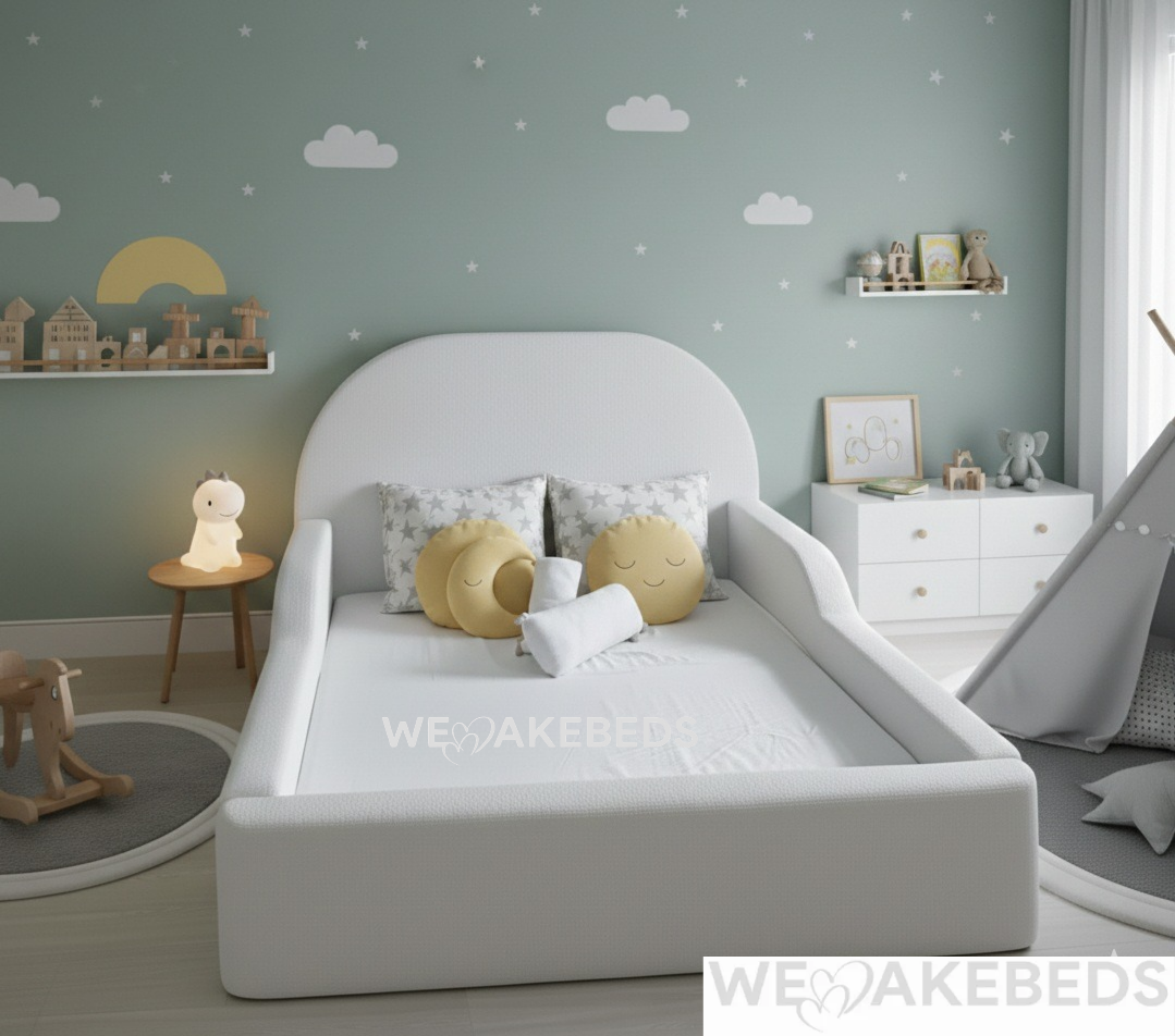 - A Hug in a Bed: The entire frame is wrapped in a thick, cloud-like soft white upholstery (like a soft boucle fabric). Every edge is gentle, making it the perfect safe spot for sleeping, reading, or even jumping!