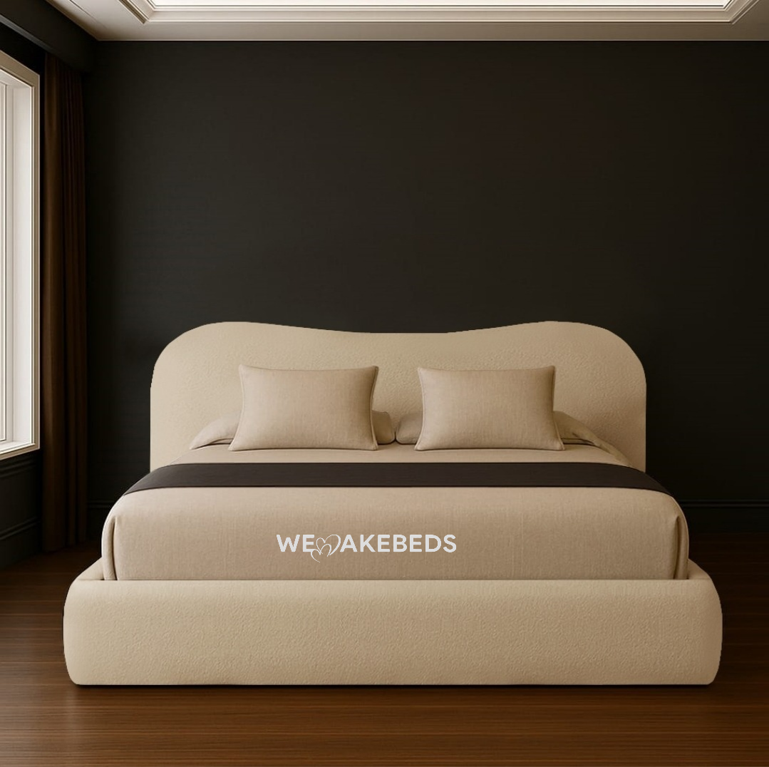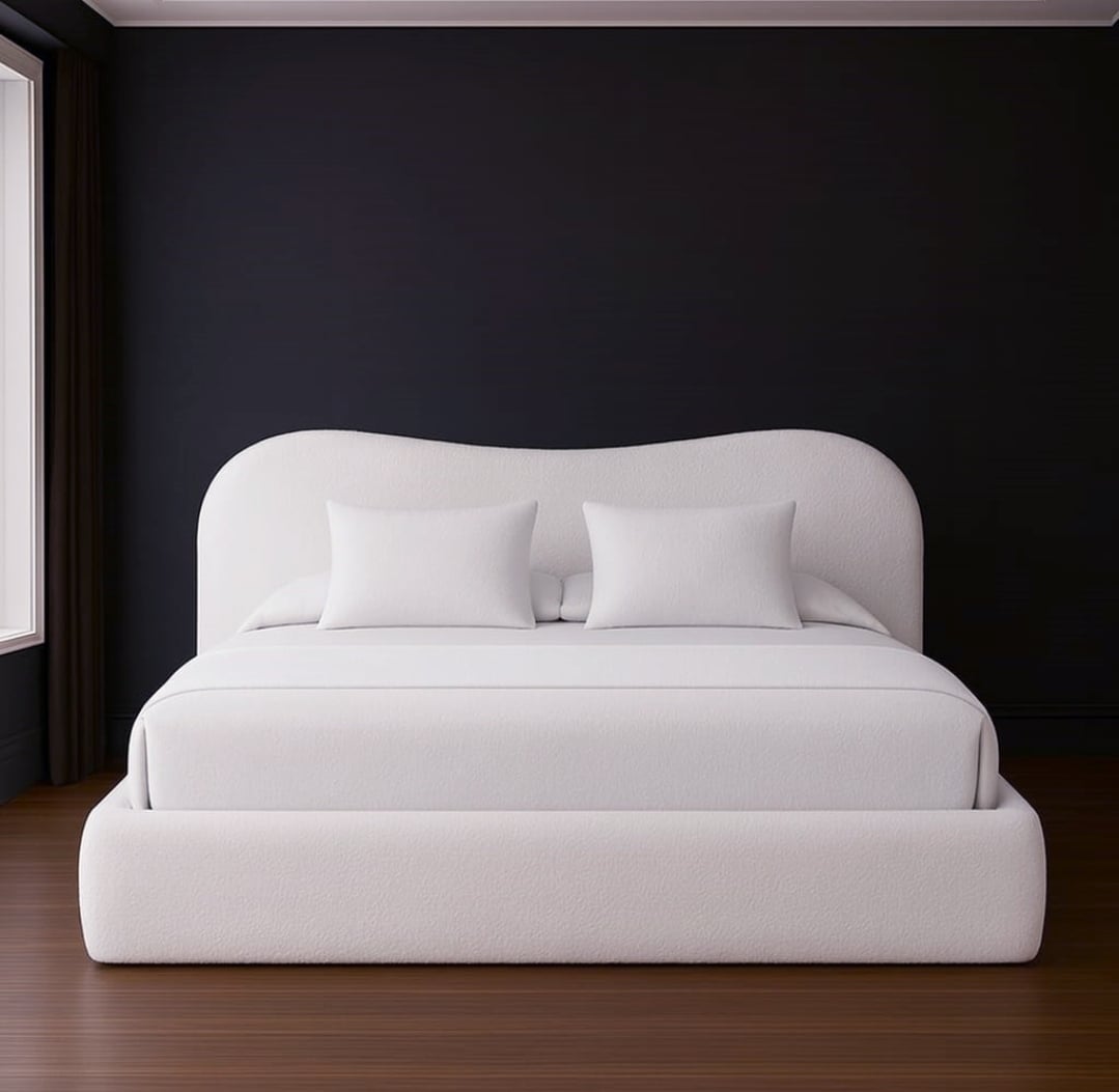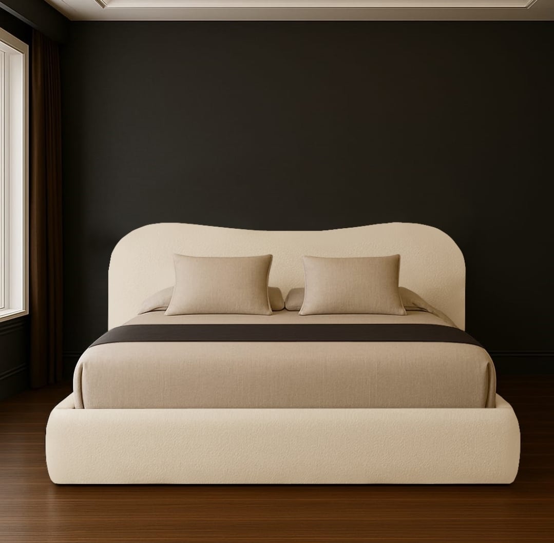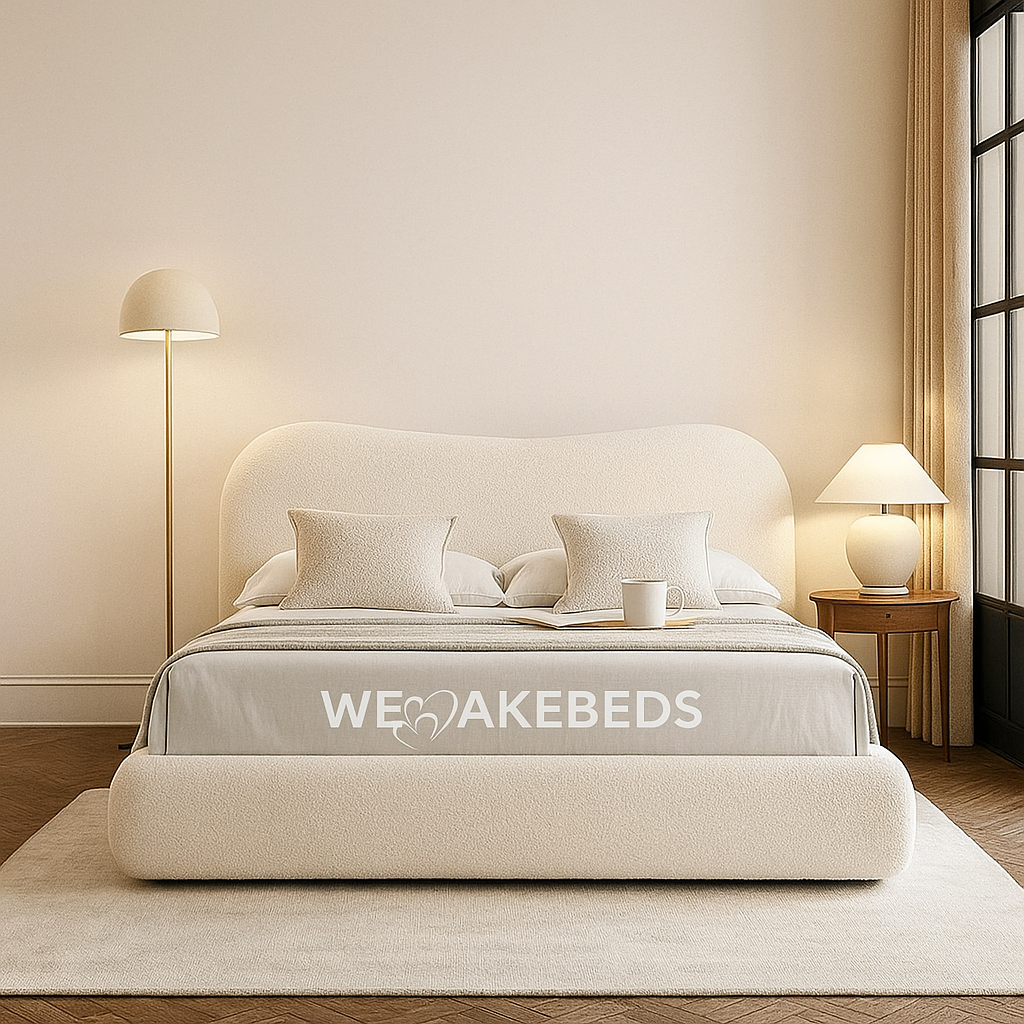Our curve teddy boucle bed features inviting curved silhouette, upholstered with sumptuous ivory boucle fabric for a chic, cosy place to relax.