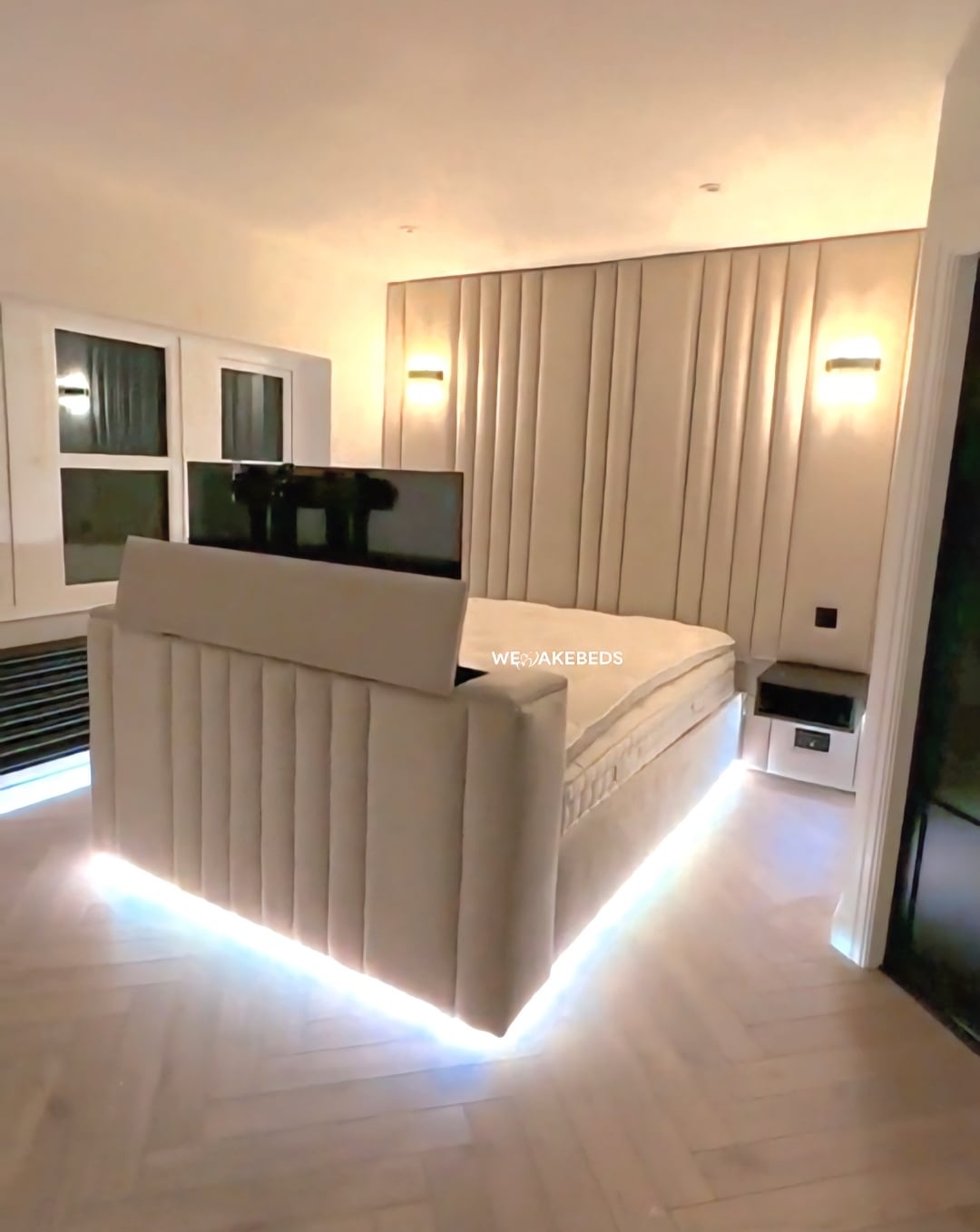 Experience the perfect blend of comfort, style, and innovation with the LuxeVision TV Bed. Designed with a modern upholstered frame and a plush headboard that exudes elegance, this bed is more than just a place to sleep—it’s a luxury lifestyle upgrade. The integrated lift-up mechanism at the foot of the bed discreetly conceals a flat-screen TV, allowing you to enjoy your favorite shows and movies at the touch of a button.you can add Ambient LED lighting beneath the bed adds a soft, creating a cozy and contemporary atmosphere. Ideal for those who value both relaxation and entertainment, the LuxeVision TV Bed transforms your bedroom into the ultimate retreat.