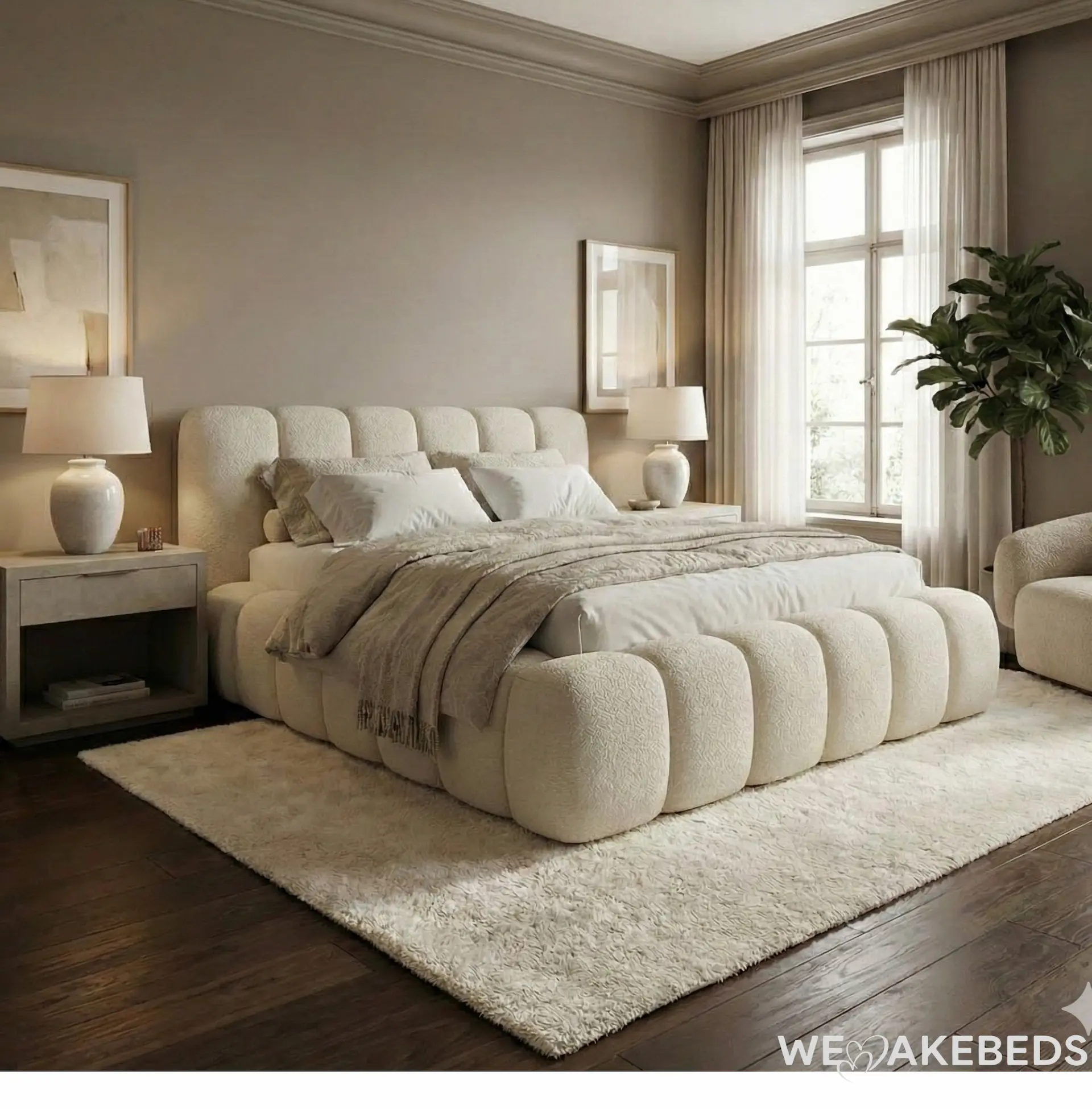 Upholstered in a premium, touchably soft textured fabric (reminiscent of high-end bouclé), this bed turns your master suite into a serene retreat. The low-profile, floor-hugging design creates a grounding, modern look, while the thick, rounded rails protect your shins and add to the cloud-like visual.