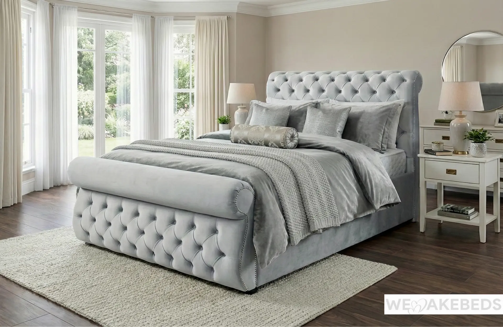Upholstered in a shimmering, soft-touch silver velvet, the Kensington features a commanding high headboard and a matching substantial footboard. Both are defined by their classic “sleigh” scroll design and meticulously crafted deep-button tufting in a timeless diamond pattern.