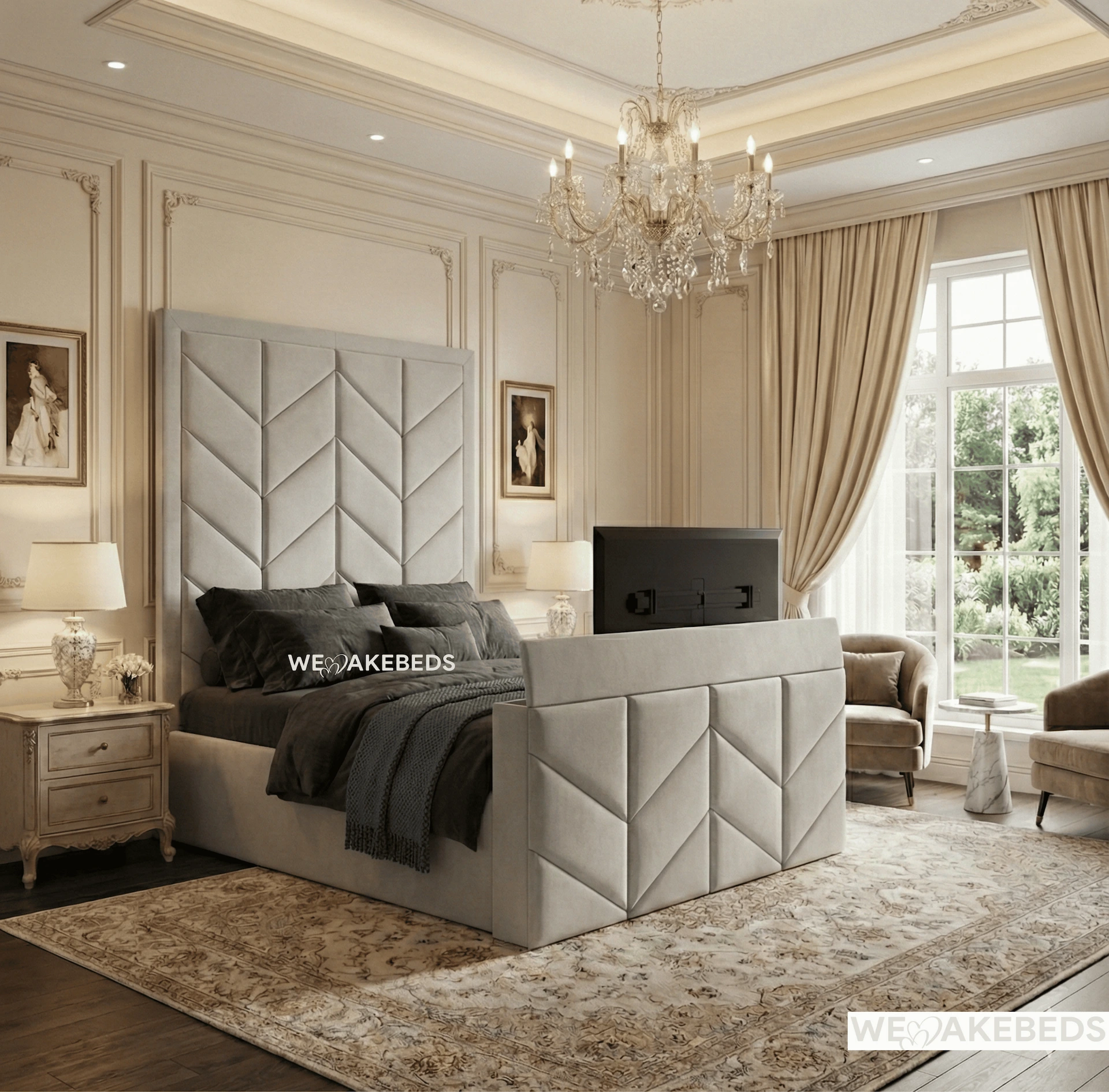 Elevate your bedroom sanctuary with The London Chevron TV Bed, a stunning fusion of metropolitan style and state-of-the-art technology. Designed for those who refuse to compromise between aesthetics and functionality, this bed frame serves as the ultimate centerpiece for the modern home.